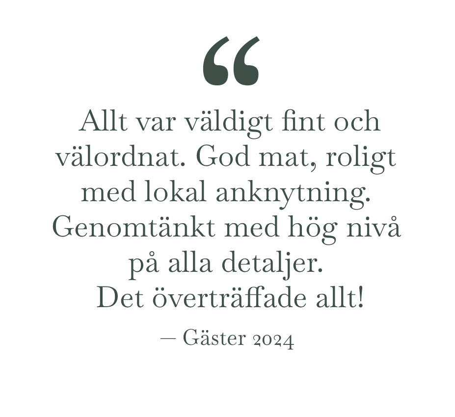 I vår dryckesmeny hittar ni Svenska viner och Europeiska producenter med hållbara jordbruk och strävan mot minimal klimatpåverkan. Såklart hittar ni även lokal öl och lättdrycker. Drycken köps till på plats men ni kan även förbeställa dryckespaket till middagarna.