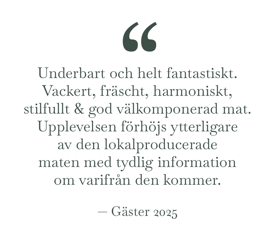 Vi erbjuder både traditionella middagar där ni blir serverade och måltidsupplevelser där ni lagar maten själva över elden. Råvaror väljs lokalt och efter säsong med gården och skogen som inspiration.